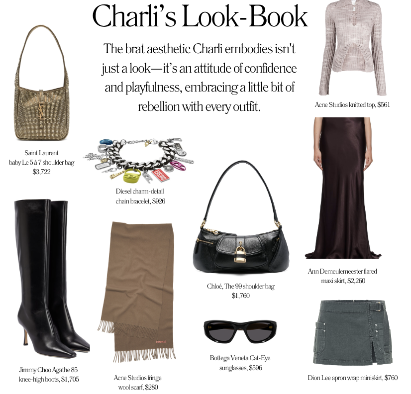 Charli mixes edgy, rebellious fashion with playful energy. bright colours, matching sets, mini skirts, and chunky platform boots are it. Her outfits often balance Tight-fitting pieces with oversized outerwear AND CHUNKY SUNGLASSES.